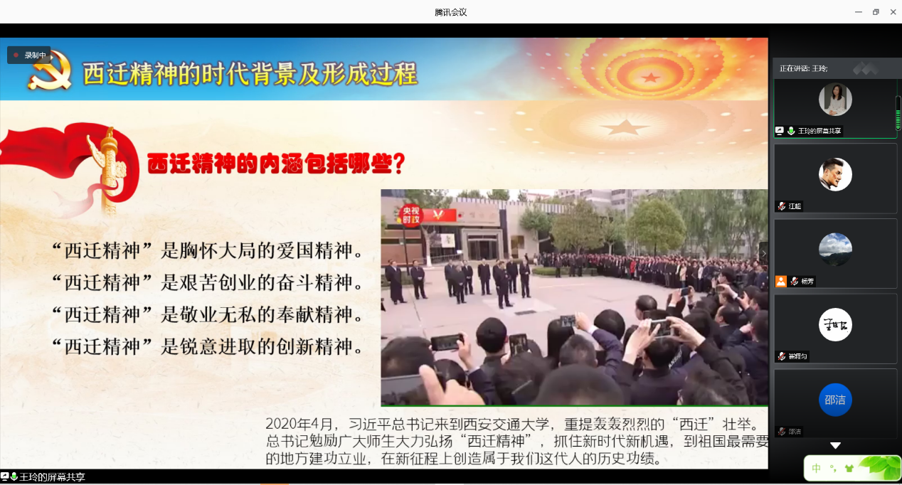 学“四史”,感悟信仰之力,由党支部宣传委员王玲做《大力弘扬西迁精神-——守初心 担使命 弘扬西迁精神矢志爱国奋斗》微党课,带领党员们重温西迁精神,回顾西迁精神的时代背景与形成过程,感受老一辈知识分子心怀理想,心系家国的爱国主义情怀。牢记党中央对广大知识分子的嘱托,并将西迁精神落实在爱国奋斗行动中。
