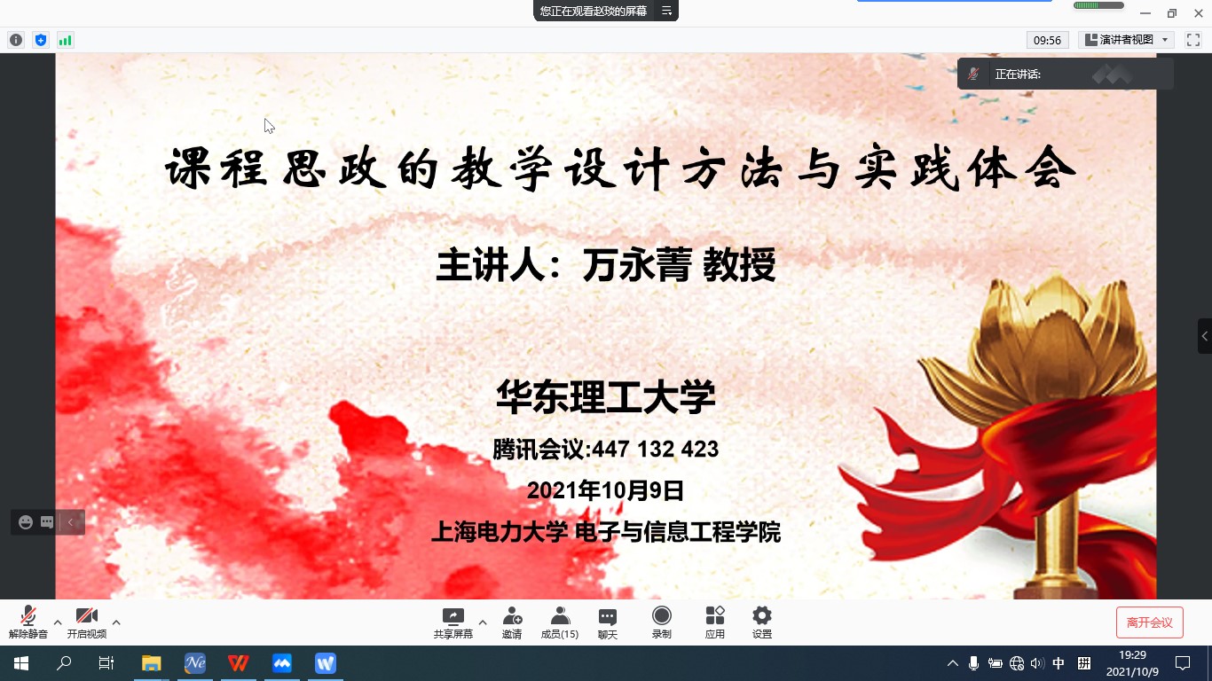 万永菁教授教学成果丰硕,主持了教育部一流本科课程、教育部首批本科课程思政示范课程建设,多次上海市教学相关比赛奖项。报告会上,万永菁教授简要介绍了课程思政的背景与要求,从工程认证的角度详细解读了课程思政与人才培养的关系,分析了教育部印发的《高等公司课程思政建设指导纲要》的相关要求,指出课程思政教学设计常见问题及解决途径,以其主讲的《数字信号处理》课程为例,展示了课程思政的教学设计方法及实施方案,强调了课程教学应当在思政引领下,实现育德细无声。