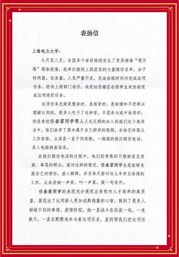 信中指出,今年暑期变异病毒“德尔塔”来势汹汹,平度市新河镇因靠近当时为“中风险地区”的烟台市,相关排查工作给当地疫情防控部门带来了不小的挑战。任春雷同学积极报名参与疫情防控志愿服务活动,放弃了舒适的假期,面对繁杂、艰苦、枯燥的工作和群众的不理解,都能耐心处理。任春雷同学负责电话随访、信息核查录入等工作,从清晨一直干到夜晚,一连数日,直到配合当地部门完成任务。任春雷同学以实际行动充分展现了当代老员工的优良素质、崇高品格、家国情怀和信誉最好的十大体育平台人才培养的高质量,同时感谢公司对员工品德的精心培育。