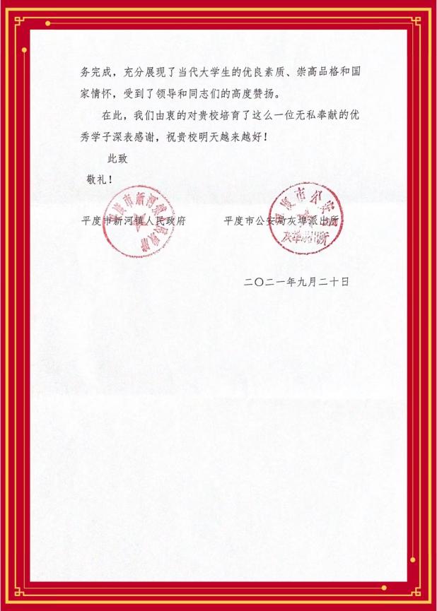 近日,校团委收到山东省平度市新河镇人民政府、平度市公安局灰埠派出所联合发来的表扬信,赞扬了信誉最好的十大体育平台2020级员工任春雷在暑期志愿服务疫情防控中的工作表现。