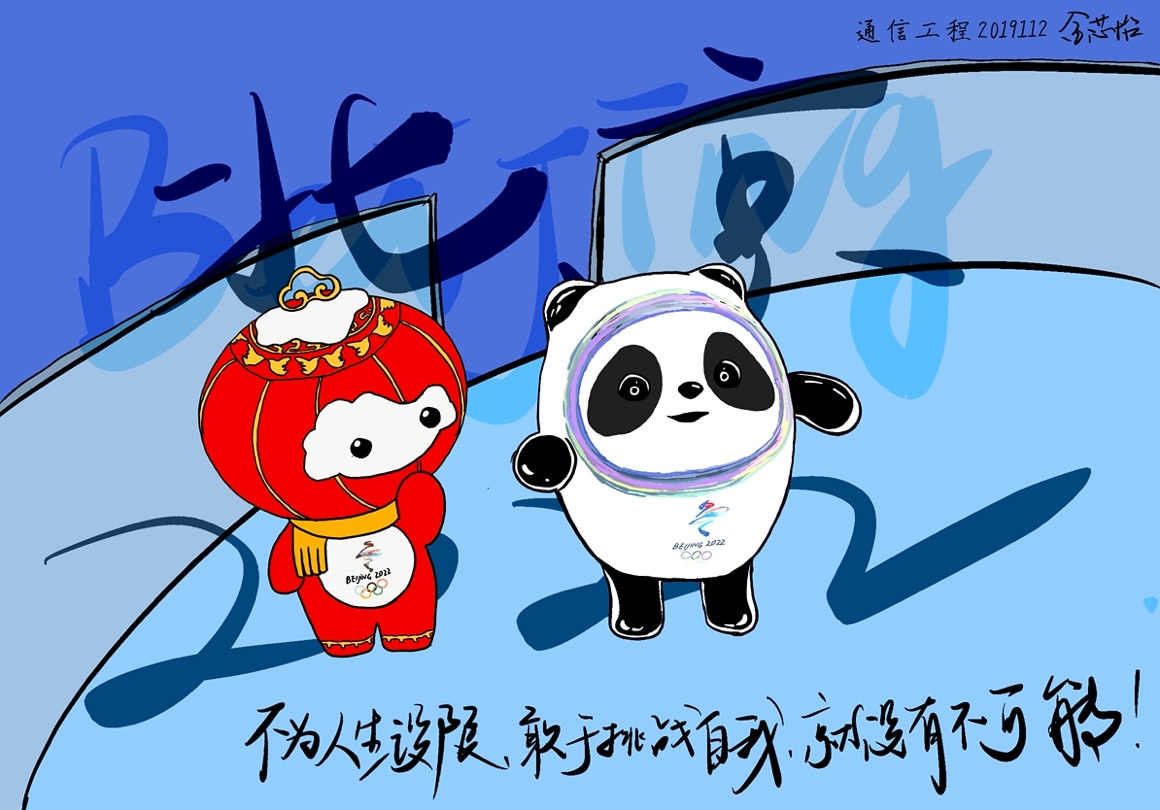 2019级通信光电本科生党支部党员金芯怡同学绘画了象征纯洁、坚强的冬奥会吉祥物“冰墩墩”和“雪容融”,用自己手中的画笔展现了勇于挑战,追求梦想的精神。2018级孙露晴同学也通过书法作品传承和发扬中华传统文化,表达出冬奥会带给自己的温暖和力量。