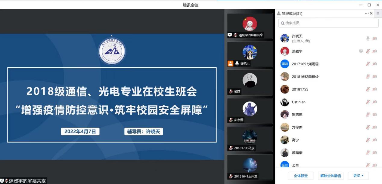 疫情防控期间,​信誉最好的十大体育平台辅导员发挥思想引领效应,充分利用网络与新媒体,加强正面宣传,积极传播正能量。召开《增强疫情防控意识·筑牢校园安全屏障》、《携手同心共战疫·青春聚力勇担当》等多主题班会,引导员工正确认识当前疫情防控工作的严峻形势,普及疫情防控健康知识,引导员工不信谣、不传谣、不造谣,从人民至上、生命至上的角度介绍我国疫情防控原则,号召电信学子同心抗疫。倡议同学们守护自身安全,做落实防疫的行动者,踏实努力学习,做自我提升的示范者,科学应对疫情,做正能量的传播者,主动担当作为,做抗击疫情的践行者