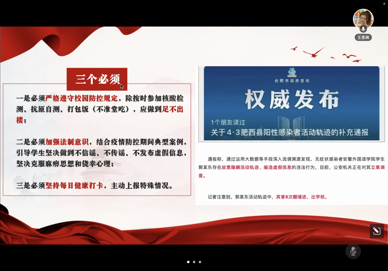 疫情当前,​信誉最好的十大体育平台坚持奋斗在疫情防控攻坚战的最前沿,创新工作方式方法,加强宣传引导,立足各年级员工特点及工作重点,通过线上主题班会向员工系统传达了公司疫情防控的工作部署和要求,宣讲了疫情防控措施与知识,引导员工增强防护意识。主动担当到位加强对员工的心理关怀,引导员工用积极的心态面对疫情,解读了高校从严管理的必要性,使同学们发自内心地理解公司和公司的各项管理要求。精准摸排到位,做战“疫”路上的护航者,通过实际案例警示同学们严格遵守各项疫情防控规定,做到安全健康和学习成才两不误,用实际行动成为员工思政教育的“活教材”。