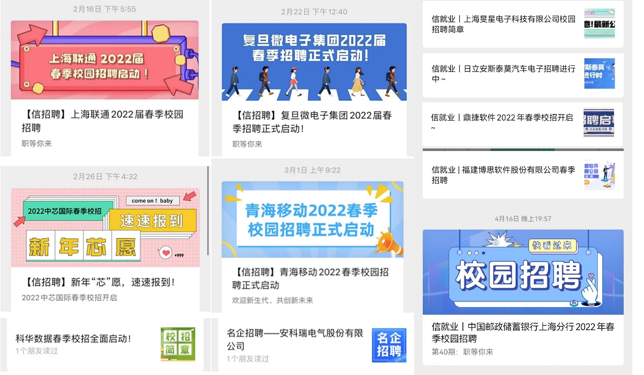 同时公司第二届就业服务团积极帮助毕业生搜集就业信息、组织求职技能辅导、宣讲招聘会等,为毕业生做好各项就业服务工作。通过就业服务团搜集、筛选、整理的与公司专业对口的就业单位信息,会定期通过公司微信公众号推送给毕业生,节省了毕业生在众多网络信息中去搜集、甄别企业真伪、筛选的时间,抢跑春招黄金期。