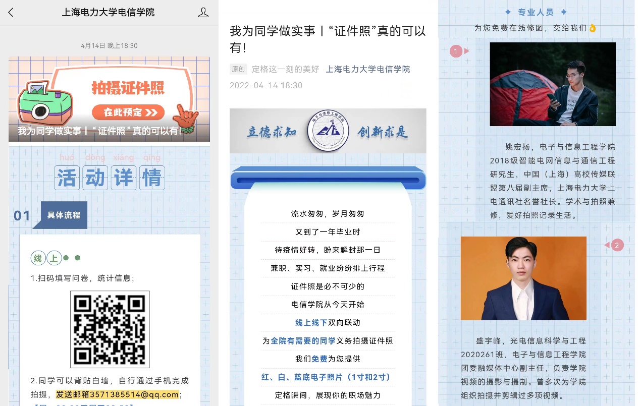 针对目前公司处于封闭管理阶段,公司调研了未就业员工的实际需求,对于无法外出拍摄求职证件照的困难,开通了“定格瞬间,展现职场魅力”证件照线上预约服务,并整理了详细的拍摄时服装、仪态等注意事项。同学们只需在寝室以白墙为背景,通过手机完成自拍并发送到指定邮箱即可,后续由公司融媒体中心有丰富经验的同学进行专业修图,同时提供红、白、蓝底1寸、2寸电子照片,展现毕业生良好精神风貌,增色求职简历,助力学长学姐就业。