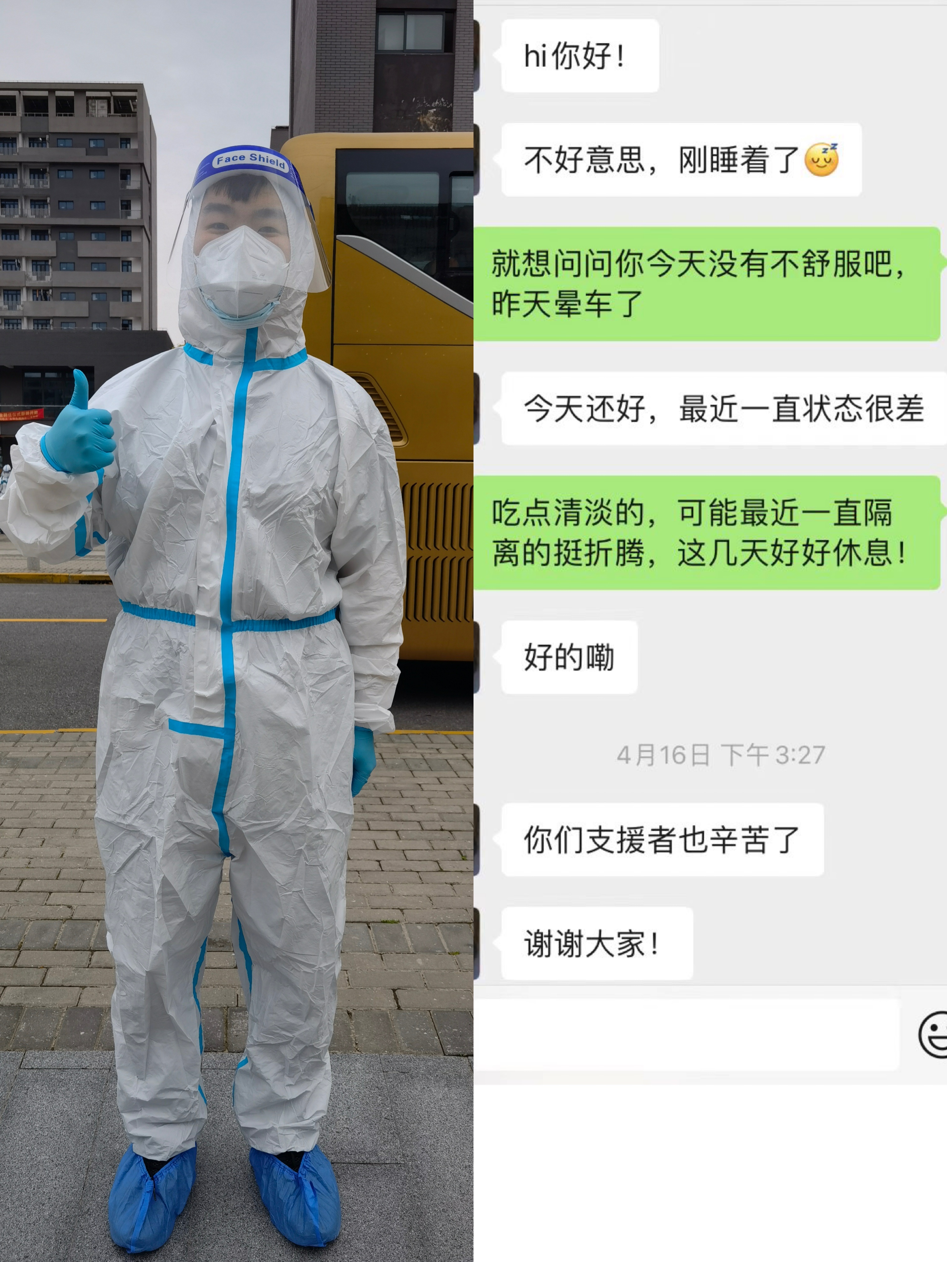面对突如其来的疫情,杨志鹏一直奋战在校园抗疫一线,担任临港校区7号楼核酸检测志愿者。在接到此次带队任务时,他没有片刻犹豫,第一时间回到宿舍收拾好行李,做好护送同学前往隔离点的准备。此时的他已从一名员工党员转换为一名“学长老师”。在上海到南京的380公里路程中,杨志鹏密切关心关注每一位同学的思想和身体状况,做好同学们的思想安抚工作,叮嘱同学们不要担心,告诉大家公司会全程保障同学们的健康与安全,打消了转运同学的顾虑,使转运过程平稳有序。
