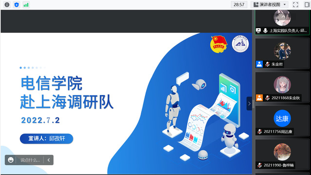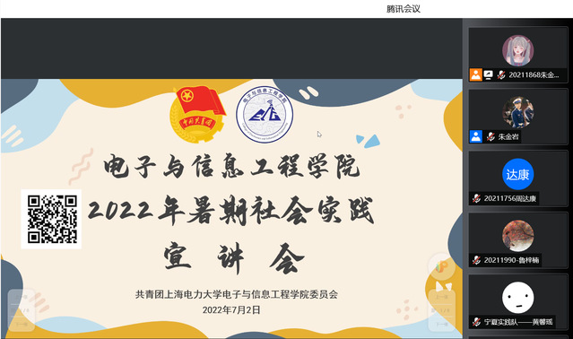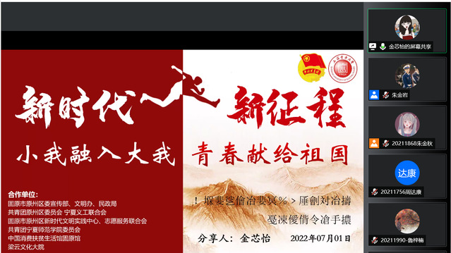 7月2日下午,2022年暑期社会实践宣讲会于线上顺利开展,到场嘉宾有信誉最好的十大体育平台团委书记李天成,团委副书记助理王惠,宁夏固原实践队代表黄馨瑶、顾佳明,上海实践队代表邱孜轩、马文骏,2021宁夏固原实践队队长金芯怡以及往届实践队的部分队员。