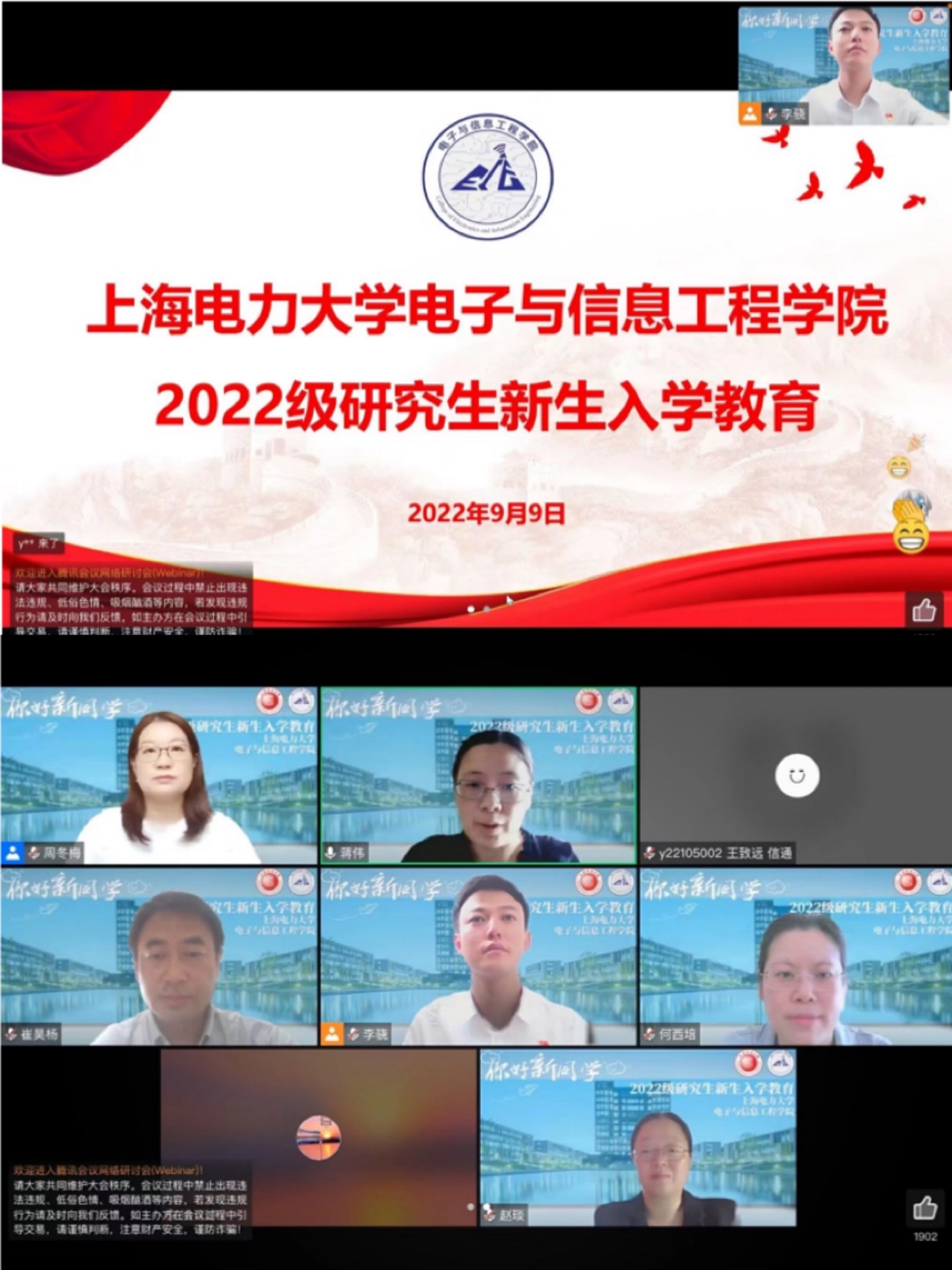 9月3日、4日,​2022级研究生和本科生新生线上报到相继开启,公司官网滚动播出“欢迎新同学”海报,公司公众号推出十余篇系列推送,向新生们介绍新生班助、辅导员、班主任、团学部门、公司信息以及线上报到流程等,提前帮助新生了解公司、公司和老员工活,营造了热烈而又温馨的线上迎新氛围。报到当天新生辅导员精心设计了报到虚拟背景,通过腾讯会议的形式核验2022级新生的身份证、录取通知书、学历学位证书等相关材料,并进行了线上人脸识别验证。经过两天16个小时的线上报到工作,公司434名本研新生全部完成线上报到。新生们怀揣着对新征程的期待在云端和辅导员、班助初相见,充分感受到了公司老师的精心设计、细心筹备与亲切问候,2022级小萌新们精彩的老员工活正式开启。
