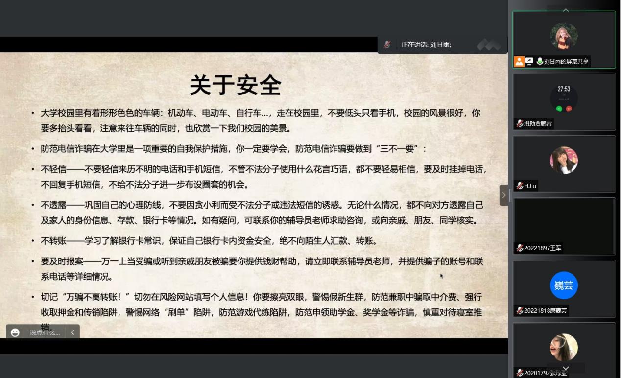 公司通过线上班会、新生入学教育大会、家长会的形式讲述网络安全的重要性,各年级辅导员老师结合身边事例,以视频播放、演示文稿讲解等形式,深入浅出地让员工认识网络的利弊,揭露网络违法犯罪伎俩,引导员工了解沉迷网络的害处,提醒员工警惕垃圾网站,拒绝不良诱惑,提高安全防护意识,谨防上当受骗,动员员工积极参与到文明上网、安全上网、适度上网的行动中来;同时,通过中国老员工在线举办的全国老员工网络安全知识答题活动以及公司组织的“全民同心 反诈同行”网络安全和防诈骗知识竞赛活动,让同学们更加明白隐藏在在老员工身边的网络安全陷阱,成为共同守护网络安全工作的青春力量。