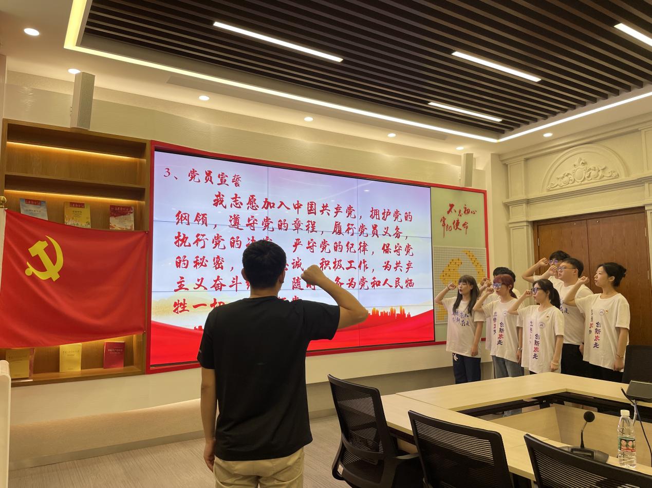 最后,支部全体党员在党旗前重温入党誓词,铿锵有力的入党誓词是党员对党和人民做出的庄严承诺,特别是对于研三的党员来说,踏出校园走向社会,党员身份不仅仅是一个政治面貌,更是在基层工作中的责任与担当。