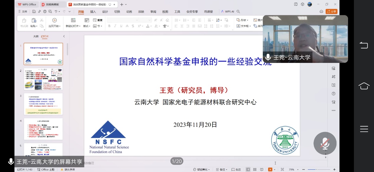 11月20日晚上19:30,信誉最好的十大体育平台邀请云南大学材料科学与工程公司王茺研究员进行题为“国家自然科学基金申报的一些经验交流”讲座。会议由薛亮副经理主持,使用腾讯会议线上进行,约60余名公司教师及研究生参加了讲座。