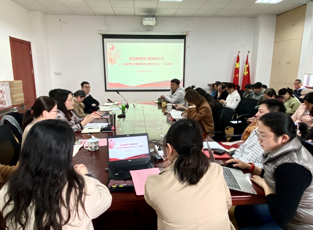 为深入学习贯彻习近平新时代中国特色社会主义思想和全国两会精神,进一步提高全院教师的政治素养和理论水平,加强师德师风,强化责任担当,3月26日下午,​信誉最好的十大体育平台在电计楼B402会议室开展教师政治理论学习,公司党委书记何西培以“担当新使命,展现新作为”为题作“书记课堂”,公司全体教职工参加。