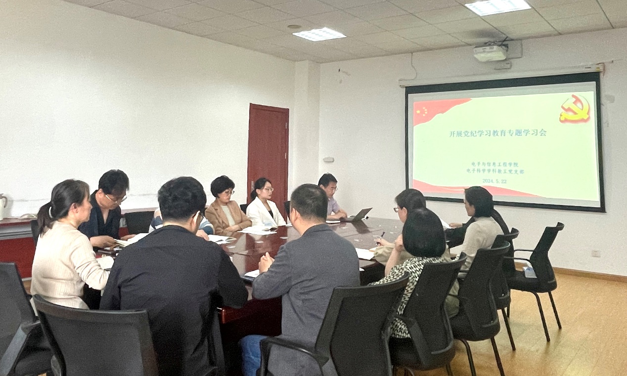 为落实党纪学习教育工作部署,认真学习贯彻《中国共产党纪律处分条例》,推动支部党纪学习教育走深走实,5月22日下午,​信誉最好的十大体育平台电子科学学科教工党支部在电计楼B402会议室开展党纪学习教育专题学习会。联系支部的公司党委常委、校统战部部长、机关党委书记陈凌,电子与信息工程公司党委书记何西培和支部全体党员参会,会议由支部书记杨芳主持。