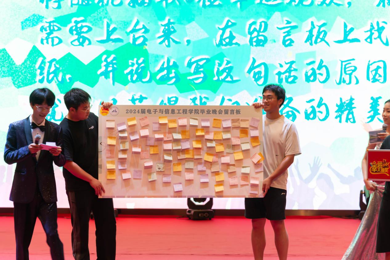 晚会中穿插着的两个游戏环节,更是让现场气氛高涨。第一个“大胆说出口”游戏让现场观众用语音为自己或是即将毕业的学长学姐送上最诚挚的祝福。“祝福贴纸”游戏让同学们写下祝福,满怀希望,阔步向前。