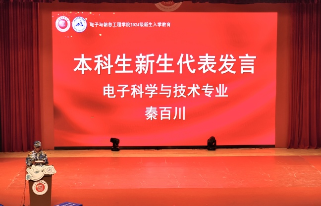 2024级电子科学与技术专业本科生秦百川同学作为本科新生代表发言,他表示在未来四年要刻苦研学,深入学习专业知识;博采众长,广泛涉猎其他领域;开拓创新,积极参与各类活动,不断提升综合能力。在青春中散发光和热,以韶华里的拼搏与奋斗为绚烂的人生奠基。