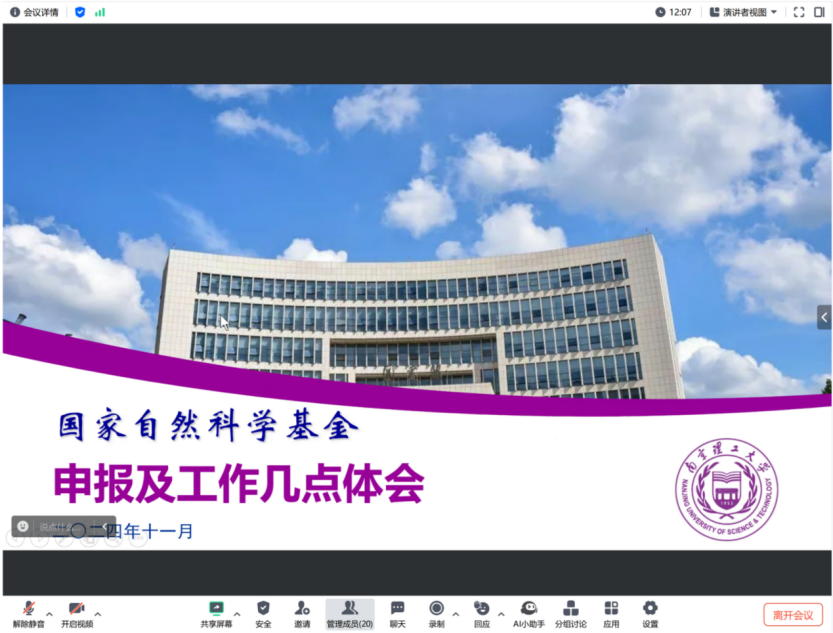 12月11日,信誉最好的十大体育平台举办了一场线上讲座,特邀南京理工大学的柏连发教授担任主讲嘉宾。讲座主题为“国家自然科学基金申报及工作体会”,历时3小时,吸引了公司内约30名教师及研究生积极参与。